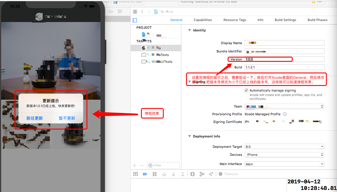 以上代码实现之后,可以测试一下弹框效果,看看有没有正常显示版本更新的弹框,具体方法就是在xcode里面把已经上线的版本修改的低一点,然后再运行一次,在模拟器中就可测试出来,具体操作如下所示: