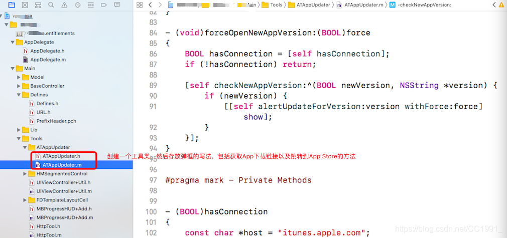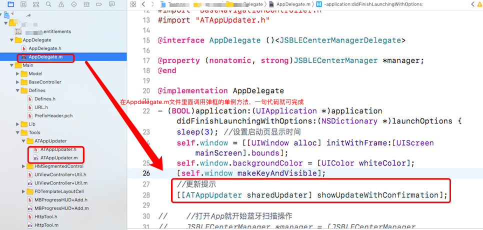 根据第三方实现App版本更新提示框,进行了封装,然后直接将AppID作为参数传进去或者直接获取应用的bundleID来使用的,把工具类拖入到项目中,只需要Appdelegate文件里面一句代码就可集成实现的方法。原创的下载链接 具体实现操作步骤如下所示: